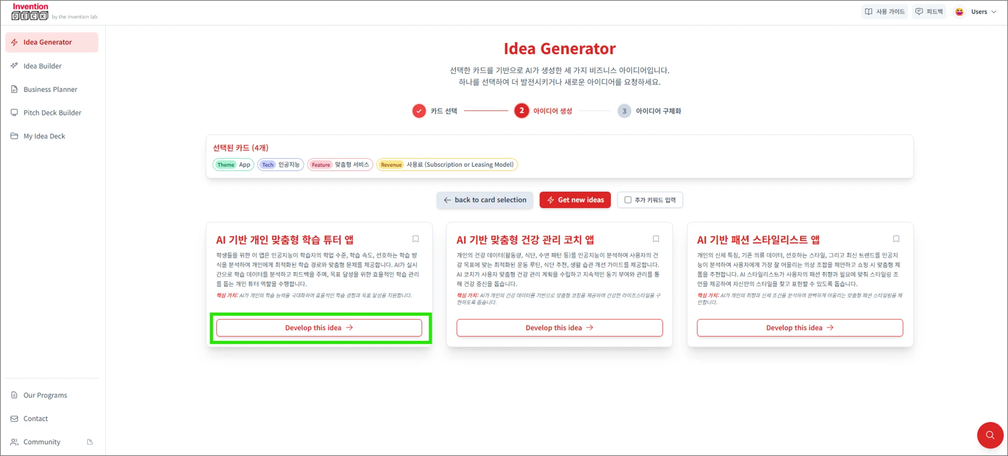 아이디어를 생성한 직후, 아이디어 카드 하단의