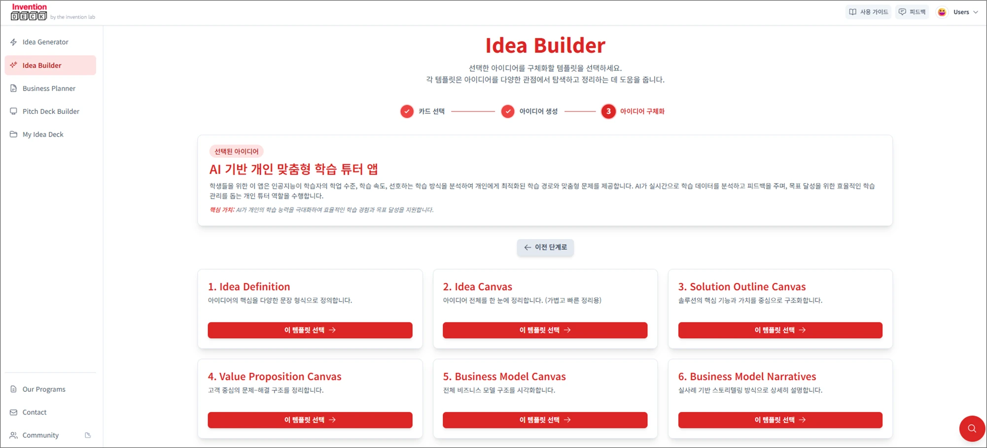 사용자는 주어진 템플릿 중 하나를 선택해 아이디어를 정리하고 사업화 가능성을 높이기 위해 구체화하고 확장할 수 있습니다.