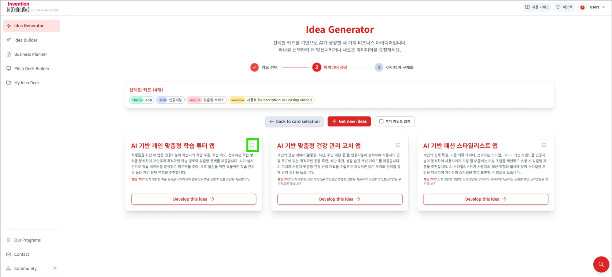 마음에 드는 아이디어가 생성되었다면 각 아이디어 카드 우측의 북마크 아이콘을 클릭하세요!