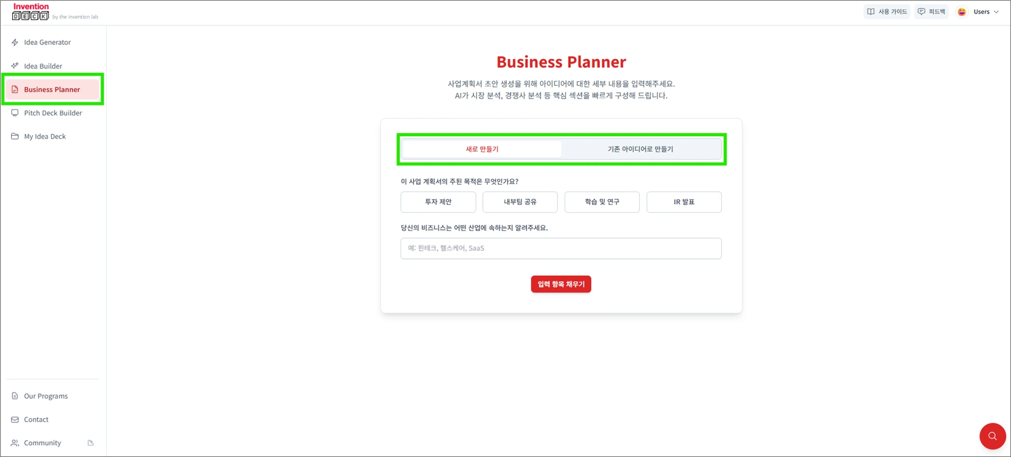 아이디어가 떠올랐다면 이제 인벤션덱AI와 함께 구체적인 '사업계획서'로 발전시켜보세요. 카드 조합을 통해 아이디어를 생성하고 이를 비즈니스 모델과 실행 계획으로 확장하는 전 과정을 단계별로 안내합니다.