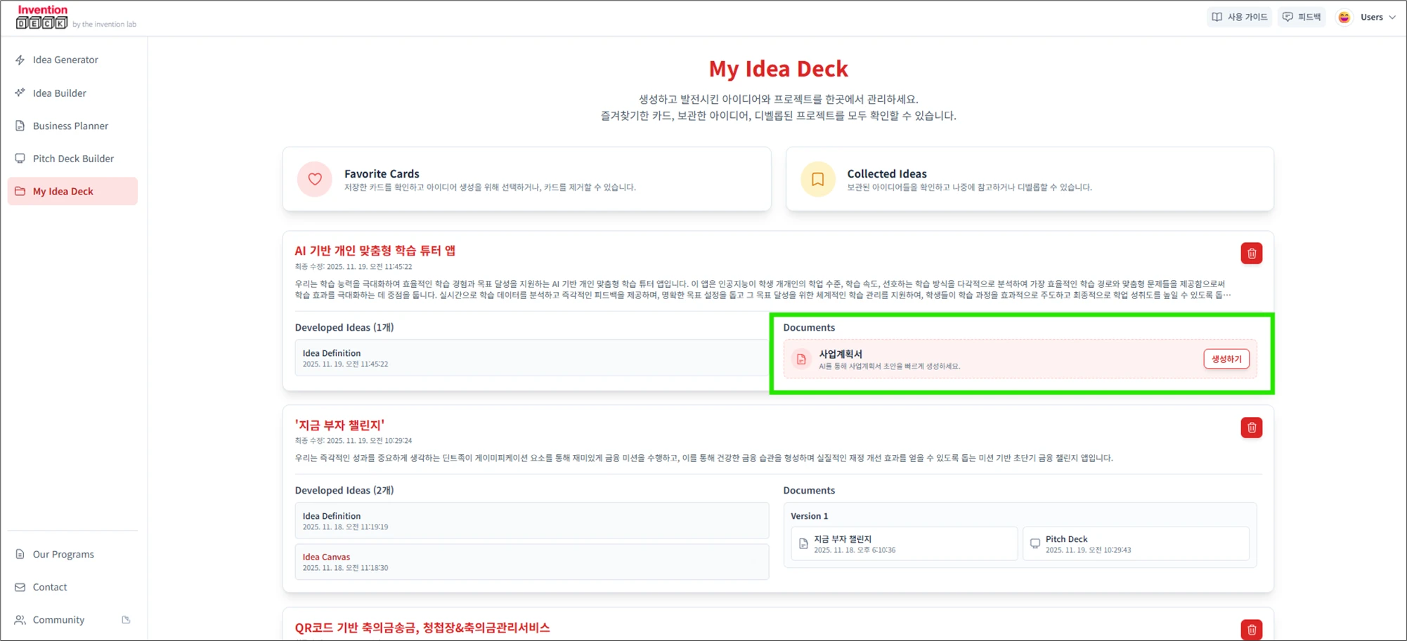 My Idea Deck을 클릭해, 사업계획서를 작성하고 싶은 아이디어 카드 내의 [사업계획서 생성하기] 버튼을 클릭합니다.