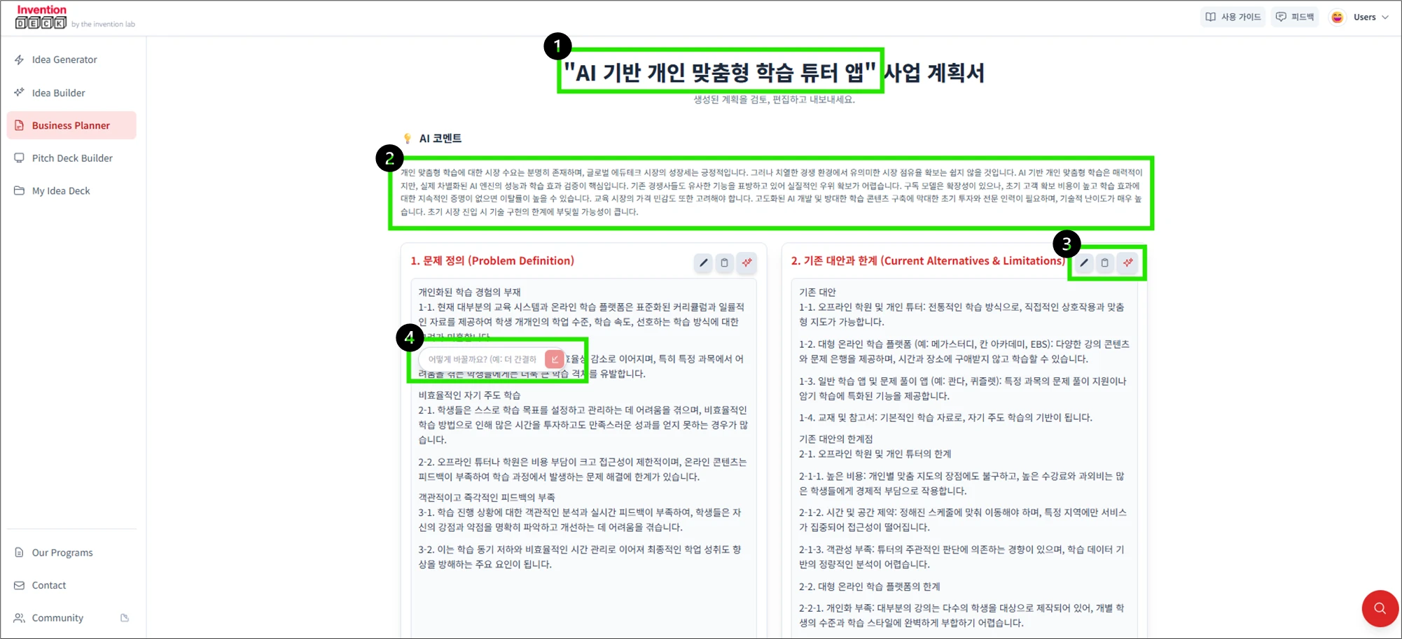 AI의 제안을 참고하면서 본인의 생각을 덧붙이면 훨씬 완성도 높은 사업계획서가 완성됩니다!