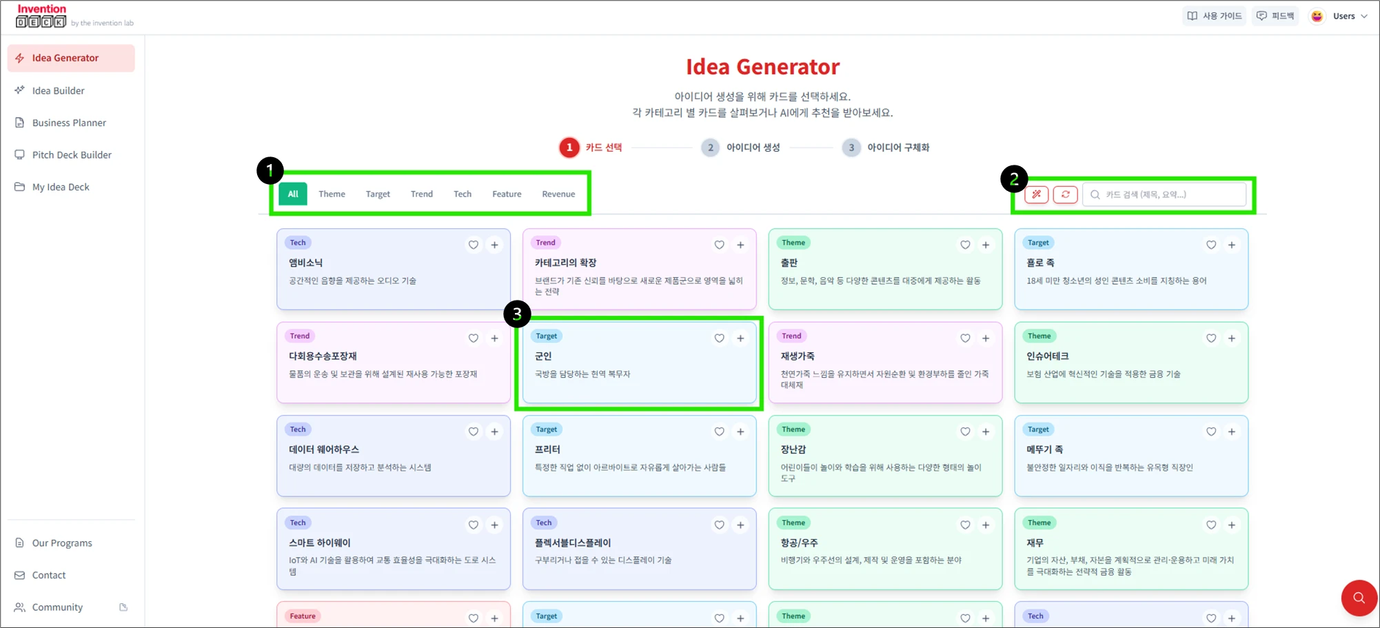 InventionLab이 큐레이션한 다양한 아이디어 카드를 탐색할 수 있는 단계